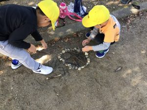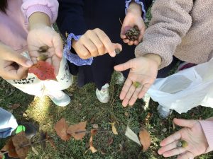 1年生が生活科の学習で、近くの 公園へ「あきみつけ」に出かけました。子どもたちは、どんぐりや松ぼっくりを探したり、色とりどりの落ち葉を集めたりして、秋ならではの自然をたくさん見つけていました。落ち葉を使って遊んだり、お友だちと見つけたものを見せ合ったりしながら、秋のすばらしさを感じることができました。