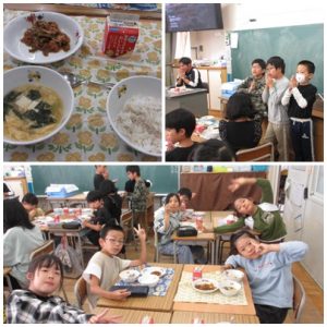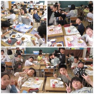 「給食、いっしょに食べよう?!」と声をかけられ、4年生の教室へ。時間内に配膳を終わらせようと頑張る当番の子。手洗いをして静かに席で待つ子。さすが4年生、役割を理解し協力して準備をしていました。「いただきます!」をすると、仲良く会話をしながら楽しい会食の時間。みんな笑顔でした。終わりに食缶をのぞくと、すべてからっぽ。食欲旺盛な4年生たちでした。ごちそうさまでした!