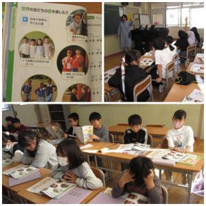 次に、音楽の授業は、「世界の友だちの歌を楽しもう」がめあて。歌は世界の国々で歌われています。みんなで歌う楽しさ、合奏する楽しさは万国共通。世界の歌を勉強したら、今日も先生といっしょに笑顔で歌いました。
