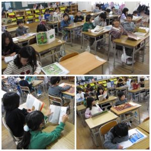 さて、今週からどんぐり読書週間が始まっています。朝の15分の時間は、みんな静かに読書タイムです。図書館の前にはおすすめの本が紹介されています。子どもたちは、お気に入りの本を図書館で借りたり、学級文庫の本を手に取ったりと本と向き合っています。現実から離れて物語の世界に入り込んだり、歴史や科学などの本から新たな発見があったりと、本の魅力をたくさん感じてほしいなと思います。