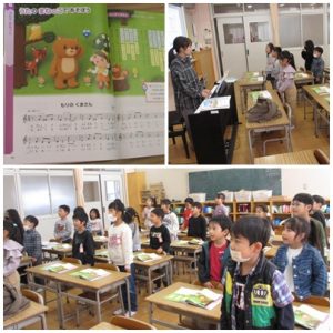 低学年音楽室から1年生の元気な歌声が聴こえてきました。今日の歌はもりのくまさん。「うたのまねっこであそぼう」をめあてに、先生のまねっこをしながら笑顔で歌う子たちの姿がありました。上の写真は、みんなで歌い出しをそろえるようと、息を合わせようとがんばる様子。がんばっています!