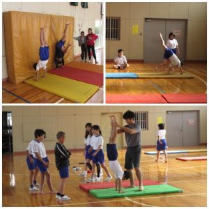 また、あるクラスは体育館でマット運動に行いました。今日は手や背中を使って体を支える運動、倒立や側方倒立回転に挑戦。普段やらない体の使い方なので、つまずくことは多いですが、くり返し練習をしていき、先生や友だちにアドバイスをもらいながら、技術を獲得していきます。コツをつかんでほしいなと思います。