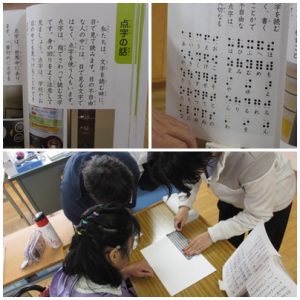 えがおの国語では、「点字の話」を読みました。点字とは何かを確認した上で、今日は実際に道具を使って点字を打つ体験をしました。世界中の目の不自由な人たちとお話することができる点字。このすばらしさに触れることができたようです。