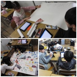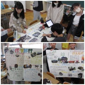 6年生の総合的な学習の時間では、京都・奈良での修学旅行のまとめを行っていました。タクシー分散学習で見聞きしたことを班の友だちと一緒にまとめていきます。撮影した多くの写真を眺めて思い出しながら振り返る姿がありました。