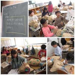 また、あるクラスでは、「くしゃくしゃ ぎゅ」を作っていました。これは、大きな紙袋やひもなどの材料を使って、思いついた形を作品にしていくものです。目や口をつけたり、服を着せたりとイメージを膨らませて作る姿がありました。楽しくくしゃくしゃにした紙からどんな作品ができ上がるのか楽しみです。