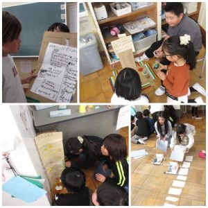 図工の授業をのぞくと、今日は手作りおもちゃのお店を開いていました。これまでに班ごとに画用紙や段ボール、輪ゴムなどを使っておもちゃを作りました。楽しく遊ぶためにルール説明まで考えており、完成度の高さに驚きました。みんな楽しい時間を過ごせましたね。