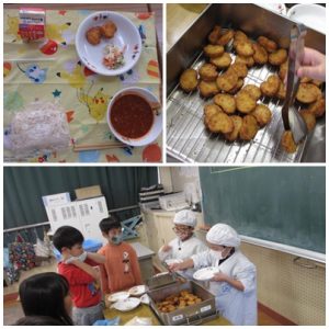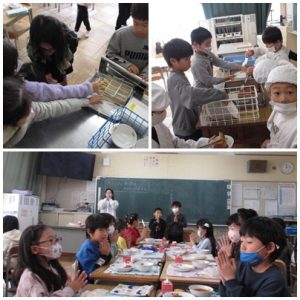 また、給食の時間に2年生の教室をのぞくと、友だちと力を合わせて配膳をする子どもたちの姿がありました。今日のメニューは、ハートの形をしたチキンナゲット、ソフトめん、ミートソース、切り干し大根のコールスローサラダ、牛乳でした。ソフトめんは人気メニューの一つのようで、みんな楽しみにしていたようです。手を合わせて、いただきます!