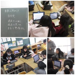 6年生総合的な学習の時間では、「未来へ向かって~自分史づくり」に取り組んでいます。子どもたちは、過去をふり返り、今を見つめ、未来を想像してみようとタブレットを使ってまとめています。「2800gぐらいで生まれて、大きな声で泣いていた」「幼いころはアンパンマンが好きだった」など、お家の方に教えてもらったことを書き込みます。この活動によって、多くの人に囲まれて育ってきたこと、同じ時を過ごした仲間がいることなど、多くの気づきがあったようです。