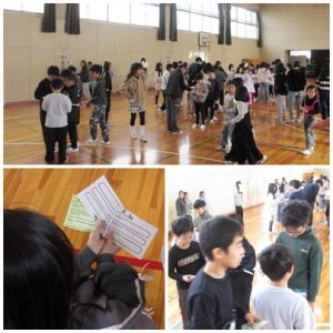 他学年の子たちとの交流を増やしたいという思いで、児童会の子たちが「めいし交換ゲーム」を行っています。今日は各学年の2組の子たちが長放課の時間に、体育館に集合して手作りの名刺を交換しました。その名刺には名前だけでなく、好きなことやクラスの良いところなども書かれています。