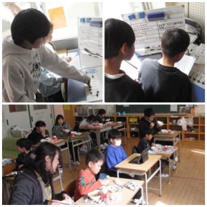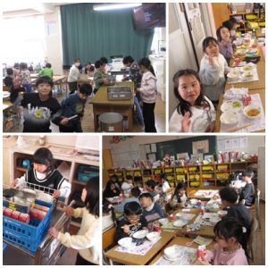 また、給食委員会からは、全国学校給食週間のお話がありました。1月26日~30日の期間中は、私たちの住む愛知県や尾張旭市でとれた野菜やくだものを使ったり、愛知県の郷土料理が登場します。今日は、郷土料理の「みそカツ」が登場。大豆から作った赤みそにみりんや砂糖を加えて作られた「みそだれ」。とんかつとの相性はバッチリです。写真のように子どもたちは美味しくいただきました。