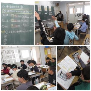 5年生の算数では、割合のグラフについての学習。「資料からわかることを考えよう」をめあてに、グラフから「もとにする量」と「比べられる量」を読み取り、割合を導き出していきます。つまずくポイントをみんなで押さえながら、答えを確認していました。