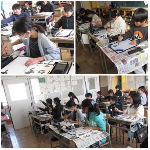 5年生の書写では、「考える子」の毛筆に取り組んでいました。バランスを整えるのが難しい4文字。字は心が映し出されるもの。心にゆとりをもち、「とめ、はね、はらい」を意識してていねいに筆を運べば、整ったまとまりのある字になります。文字を通して心を表現していきます。
