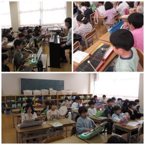音楽では、鍵盤ハーモニカや木琴やタンバリンなどの楽器を使ってみんなで合奏しました。どうしてもリズムが速くってしまうようです。先生とリズムを確認しながら息を合わせて音を奏でる姿がありました。みんないい表情で授業に取り組んでいます。