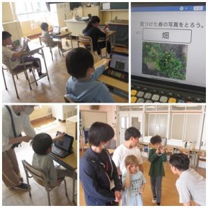 それぞれのクラスでは授業が始まっています。ひまわりでは、「春をさがそう」をめあてに、タブレットをもって校庭へお出かけ。たくさんの春を見つけたようです。