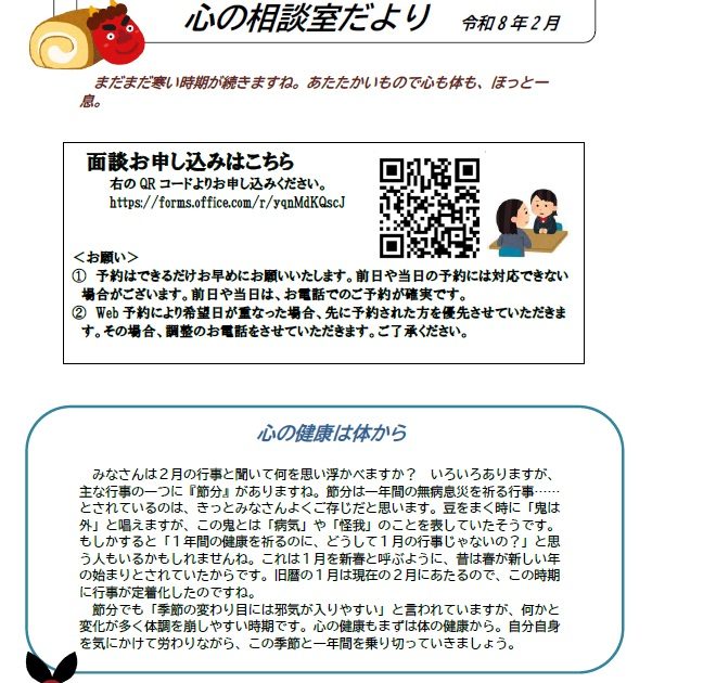 スクールカウンセラーだより2月号は、こちらからご覧いただけます。 スクールカウンセラーだより R7年度2月