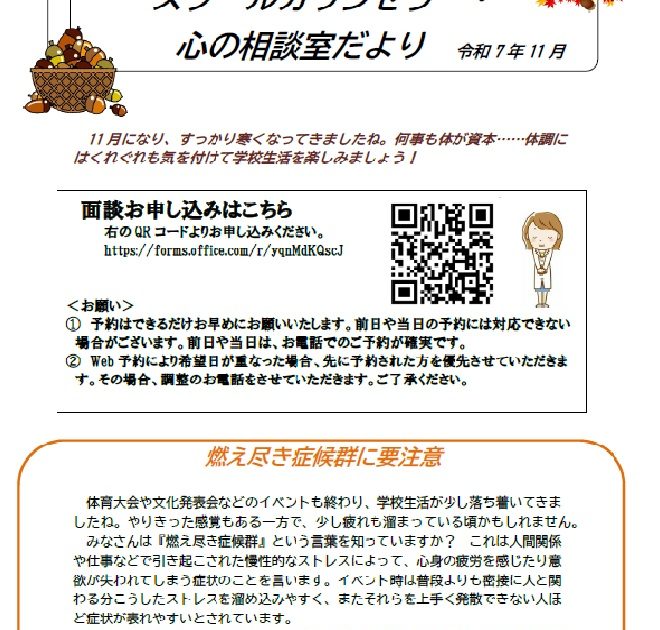 相談室だより スクールカウンセラーだより11月号 2025.11.04 by e12mg 0 スクールカウンセラーだより11月号は、こちらからご覧いただけます。 スクールカウンセラーだより R7年度11月