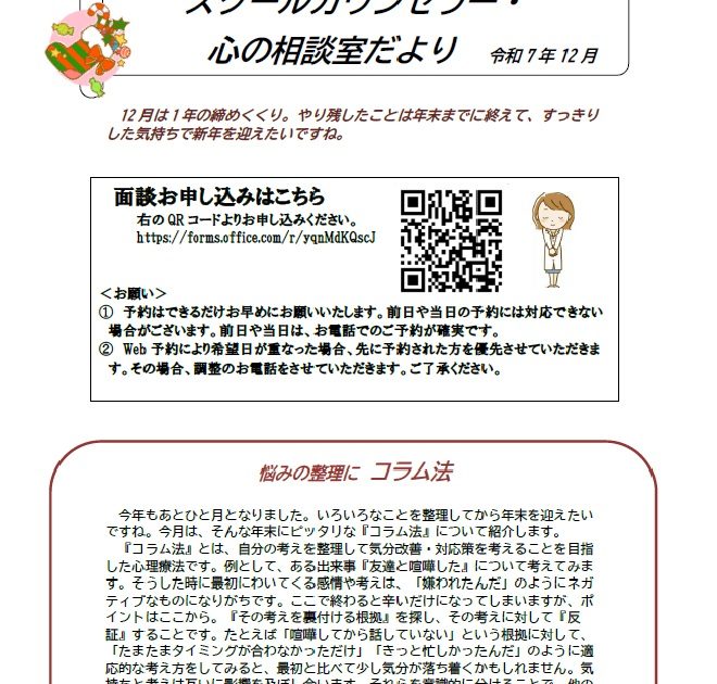 スクールカウンセラーだより12月号は、こちらからご覧いただけます。 スクールカウンセラーだより R7年度12月