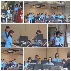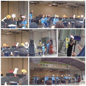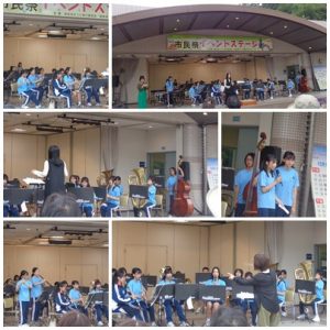 10月11日(土)、吹奏楽部が市民祭のイベントに参加しました。地域の方々がたくさん集まる中、これまでの練習の成果を生かした演奏を披露しました。「アルセナール」「双頭の鷲の旗の下に」「ディズニームービーマジック」「アンパンマン体操」の4曲を演奏しました。会場からは大きな拍手をいただき、部員たちにとって大きな励みとなりました。