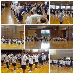 10月16日(木)5時間目、1年生が体育大会の練習を体育館で行いました。あいにくの雨で、運動場で行えず、空間を認知するのが難しかったです。並び方、準備運動、待機場所への移動の仕方など、開会式での動きを確認しました。感心したのは、準備運動です。ほとんどの生徒が、しっかり腕を伸ばしたり体を曲げたりと、きちんと行っていました。また、整列も規律正しくできていました。見ていてとても気持ちよかったです。来週の体育大会が楽しみです。