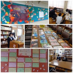 11月4日(火)から11月28日(金)まで、西中秋の本祭りが開催されています。図書室前の掲示板には図書ボランティアの方が作成してくださった秋らしい飾りで迎えてくれます。図書室中には、実写化された作品や本屋大賞を取った作品、先生のおすすめの本のコーナーもあり、手に取って読みたくなります。また、図書室内も秋が飾られ、西中のマスコット「しらたまちゃん」も隠れています。昼放課に図書室をのぞいてみると、絵本の読み聞かせをしていたり、1冊の本を何人かで眺めたり、一人静かに読書をしていたりと、一人一人が図書室を「心の居場所」にして過ごしていました。中学生の皆さんが興味をもつような本もたくさん置いてあります。この機会にぜひ図書室に足を運んでみてください。素敵な本に出会えるかもしれません。