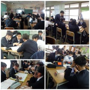 12月5日(金)3時間目に、2年C組で数学の研究授業を行いました。今日の学習目標は、「三角形の合同条件を利用した問題を解決しよう」です。8つの三角形を合同な三角形の組に分け、分けた理由をグループで考えました。また、タブレットも使い、自分の考えを書き、それをグループで共有したり、閲覧モードでクラス全体の考えを知ったりして、意見の交流もしました。グループ交流では、自分の考えを伝えたり、友達の考えと自分の考えを比較したりして、学びを深めようとしていました。三角形の合同条件をきちんと覚え、問題を考える際に活用できるようにしていきましょう。