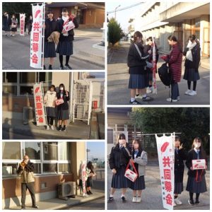 本日1月13日(火)~16日(金)まで、赤い羽根共同募金を実施します。赤い羽根募金は、私たちの住む尾張旭市の様々な立場の人を支え、みんなが暮らしやすい町づくりのために役立てられます。朝、昇降口付近で福祉緑化委員会の生徒が、旗と募金箱を持って呼びかけをしています。本日は、募金活動が初日だったので、準備ができていない生徒が多かったようです。あと3日あります。ぜひ、ご協力よろしくお願いします。募金活動でみなさんの優しさや思いやりを届けましょう。