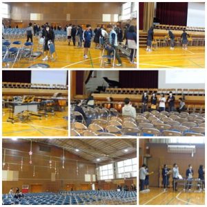 3月2日(月)授業後、生徒会執行部、生徒議会、お手伝いの生徒の皆さんで、三年生を送る会の準備をしました。椅子を並べ、飾り付けをし、リハーサルをしました。時間のない中、3年生を送る会に向けて、それぞれの学年で練習をしてきました。1・2年生は、3年生に感謝の気持ちを伝えられるとよいですね。