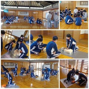 3月16日(月)2年生の体育の授業で救命講習を行いました。消防署の方にきていただき、説明のDVDを見て学んだ後、実際に、心肺蘇生とAEDの使用について体験をしました。胸骨圧迫では、思いのほか、力がいり、やり続ける大変さを実感していました。今後、このような状況にあったとき、学んだことを思い出して、少しでも行動できたり、役だったりできるとよいと思います。いざというときに知識があるだけでも行動が変わっていきます。
