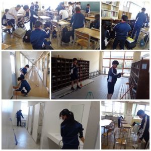 3月16日(月)6時間目、1年生が環境整備を行いました。前半は、教室の自分の机やロッカーの中を、後半はいつもの掃除場所をより入念に掃除しました。1時間という短い時間でしたが、1年生のみなさんは、一生懸命掃除に取り組んでいました。4月になったら、新1年生が入学してきます。みなさんのおかげで、きれいな環境で1年生を迎えることができそうです。
