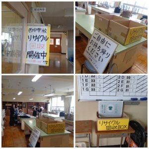 4月27日(月)13:30~14:30に、PTA主催「リサイクルマーケット・回収」を行いました。24名の保護者の方に来ていただき、たくさんのリサイクル品をお渡しすることができました。昨年度の3月には、たくさんのリサイクル品を回収でき、それを必要な方に還元できました。ありがとうございました。今年度より、常時、職員室前にリサイクルボックスを設置し、来校された折や生徒を通しての回収ができるようになりました。リサイクルできる物がありましたら、ぜひご協力をお願いします。