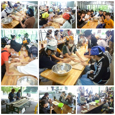 2日目の朝の集いの後は、朝食です。尾張旭よりも涼しい郡上の森の朝にはぴったりの温かい豚汁がしっかりと体を温めてくれました。その後、全員でバンガローや炊事場の清掃を行いました。荷物をまとめた後は、郡上八幡自然園での最後の体験活動です。「うどん作り」と「五平餅作り」それぞれの希望に合わせた活動に参加して、作ったものを味わっていただきました。