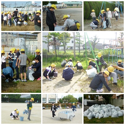 17日金曜日に予定していた除草作業が前日の降雨で延期になったため、本日1時間目に実施しました。昨夜から降っていた雨のおかげで土が軟らかくなっていたこと、曇りで涼しい風が吹いていたことで、除草作業にはとてもよい日でした。子どもたちは各学級の分担箇所に分かれて、張り切って敷地内の草取りやグランドの石拾いを行いました。全校で取れた草は、なんと103袋分!!みんなの頑張りがよく分かります。