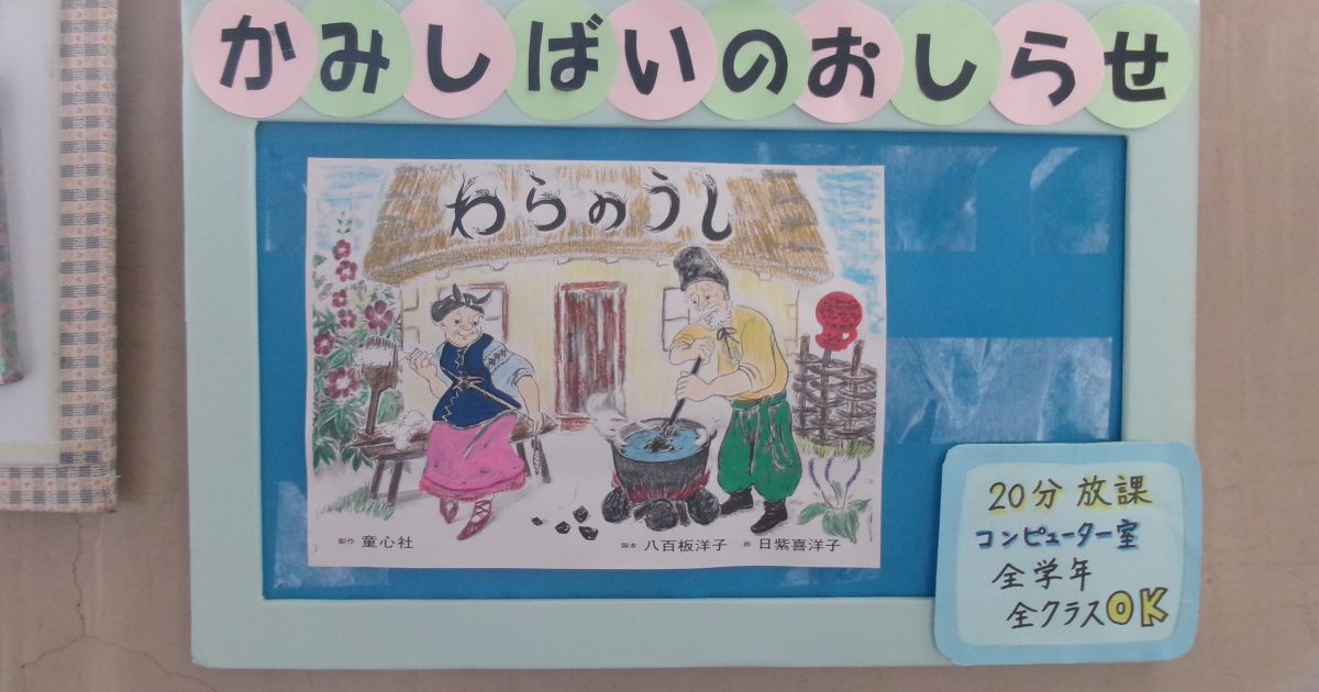 11月17日(月)の20分放課、紙芝居の会がありました。紙芝居の題名は、『わらのうし』。おじいさんは、わらを束ねて牛を作りました。喜んだおばあさんは、わらの牛を連れて丘の上の草原に行きました。そこで、わらの牛に起こった出 […]