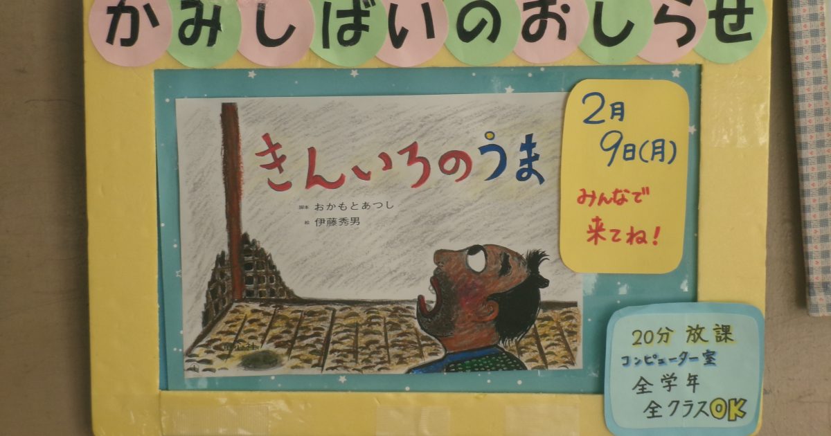 2月9日(月)の20分放課、今年度最後となる紙芝居の会がありました。紙芝居の題名は、『きんいろのうま』。怠け者のごさくは、びんぼう神に命じられた通り、宝物をたくさん積んだ金色の馬と銀色の馬を捕まえようとしますが、取り逃が […]