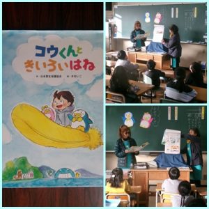12月4日(木)の朝の時間、社会を明るくする運動の一環として、更生保護女性会の方が来校されました。「ごめんなさい」の大切さを知ってもらうために、1年生を対象に『コウくんときいろいはね』の読み聞かせをしていただきました。なお、幸福の黄色い羽根は、犯罪や非行のない明るい社会を願うシンボルとなっています。