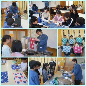 12月12日(木)、4年生がものづくり体験授業で有松絞り体験を行いました。実際に有松絞りで染めを担当している職人の方が講師で来てくださり、雪花絞りのハンカチ作りをしました。はじめに講師の先生から有松絞りについて説明をしてもらい、洋服やマフラーなどの見本を見せていただくとともに、有松絞りの歴史や工夫、職人の技術について詳しく教えてもらいました。社会科や国語で工芸品について学んできたこともあり、子どもたちは興味深く話を聞いていました。その後、自分の作りたい模様を選び、ハンカチを織りました。「きれいに折るときれいに模様が出るよ」と講師の先生からアドバイスを受け、真剣に折っていました。自分の選んだ色でハンカチを染めてもらい、空気に触れるたびに変化していく色に子どもたちは感嘆の声を上げていました。同じ模様を選んでも少しずつ違う模様や色になるのが手作りの良さです。世界に一つだけのオリジナルのハンカチに仕上がり、とても喜んでいました。