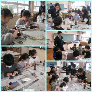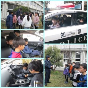 3年生の社会科では「警察の仕事」を学んでいます。1月27日(火)に守山警察の方に来ていただき、キャリア教育も兼ねた出前授業をしていただきました。警察官の仕事内容を聞いたり、手錠や警察手帳などの持ち物を見せてもらったりしました。その後、自分の指紋をとる鑑識作業体験やパトカーの乗車体験をしました。日頃できない体験に、子供たちの目は輝いていました。