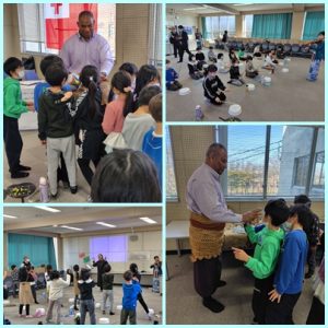 トンガ王国と尾張旭市は、愛知万博でフレンドシップ国となりました。その関係で、2月5日にトンガ学習プログラムがありました。トンガと日本で代表選手として活躍していた元ラグビー選手やJAICAで音楽指導や栄養指導をしていらっしゃった方を講師に迎え、トンガの暮らしのことをたくさん教えていただきました。また、講師の方のバイオリンに合わせて、2年生は皿太鼓でトンガの曲を演奏しました。