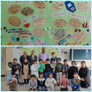 事前に講師の方をどのようにお迎えするのがよいかをみんなで考え、ラグビーボール型の紙に書いた寄せ書きや折り紙を会場に掲示しました。当日は学級閉鎖があり、1組だけの参加となったため、翌日、お休みした子に学んだことを伝えるための掲示物を作成しました。廊下に掲示したので、みんなに読んでもらえたらと思っています。なお、この日の活動の様子は、NPO法人日本トンガ友好協会のホームページにも掲載していただきました。