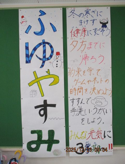 12月23日は2学期の終業式でした。オンラインでしたが、校長先生のお話をしっかりと聞き、校歌も元気に歌うことができました。式の後は生活委員会の児童による冬休みの生活のよびかけでした。「ふ=冬の寒さに負けず、健康にすごそう […]