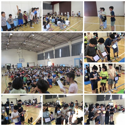 5年生が4年生を招待し、体育館で林間学校の報告会を開きました。5年生は、9月に郡上八幡自然園でキャンプに行ってから、ずっとまとめをしていました。この報告会用に様々な場面で一生懸命にメモを取っていた姿を思い出します。水族館見学や体験活動の途中で「4年生が聞いていて、わかりやすくまとめたいんです」と、笑顔で話してくれた子もいました。4年生のみなさん、報告会を聞いて、さらに来年が楽しみになりましたね。キャンプを終えてから、高学年としての意識が高まってきた子もたくさんいます。これからも6年生と一緒に学校のリーダーとしてがんばってくださいね!