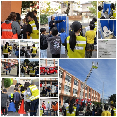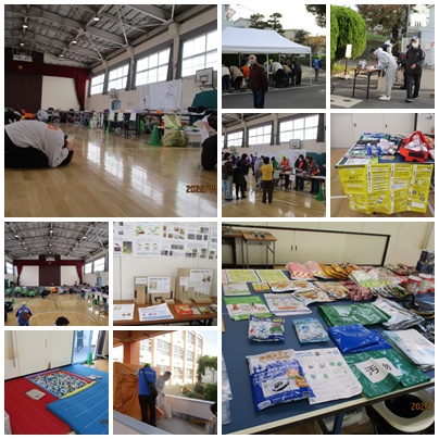 11月23日に城山校区防災訓練が行われました。午前8時に震度6強の地震が発生し、小学校の体育館に避難するという想定です。それぞれに徒歩で避難し、避難所受付・ボランティア登録の訓練からスタートです。その後、火災報知器設置の説明や参加者全員でのシェイクアウト訓練と続きます。さらにグループに分かれてブースごとに見学や体験をします。体育館の中にはパーテーションテント、段ボールベットの設置の様子や家具転倒防止の展示などがあります。