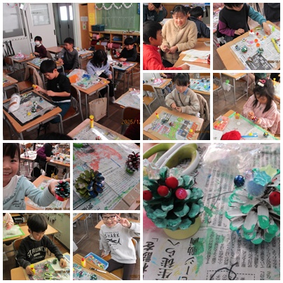 2年 2年生まつぼっくりツリー 2025.12.25 by e05wr 0 冬休みに入りました。みなさん元気に過ごしていますか?2学期の各学年の活動を紹介します。この日、2年生の教室ではミニツリー作りが行われていました。以前拾ってきた松ぼっくりに、小さな木の実や枝、加えて自分でもってきたビーズなどで飾り付け、素敵なツリーが次々に完成しました。ペンでカラフルに色を塗っている子もいます。生活科では年間を通して季節の変化を学びます。冬はどんな発見があるでしょうか?お休み中に「冬探し」をしてみてもいいですね。