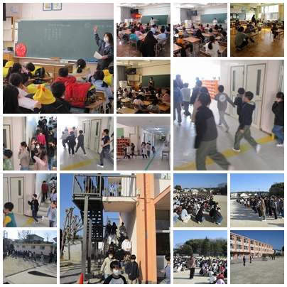 1月16日、全校で火災時の避難訓練を行いました。火事が起きたときに安全に避難するにはどうしたらよいかを考え、行動します。今回は北館1階の理科室から出火したという想定でした。訓練の前にそれぞれの教室で事前指導の ①火事が起きたときは火元がどこかをしっかり聞く ②火元から遠い経路で避難する ③「お・は・し・も・な」(押さない・走らない・しゃべらない・もどらない・泣かない)を守る ④ハンカチなどで口を覆う ⑤おりてくるシャッターの下は通らない という話を聞きました。真剣に話を聞く姿が実によかったです。実際にベルがなり、教頭先生の避難指示が流れます。安全なルートを考えて全校で速やかに避難することができました。消防署員の方や校長先生からの話を聞いたり、先生たちの初期消火訓練を見たりしました。全校での訓練後、6年生は煙道体験をし、実際に煙がどのように部屋に充満するか、どのような体勢だと安全に避難できるか、を学びました。ご家庭でも今日の訓練の話や家では火事のときにどうするかなどを話してみるとよいですね。