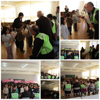 3月5日の木曜日にスクールガード連絡協議会を開きました。坂道やカーブの多い城山小校区ですし、朝の時間帯は通勤のため、住宅街をたくさんの車が通っていきます。自分の命は自分で守れるよう、周囲に気をつけて歩きたいものです。話し合いの後、1年生による感謝の会が開かれました。多目的室で花束贈呈と感謝の言葉と歌のプレゼントです。毎日、みんなの登下校の安全を守ってくださるスクールガードさん。本当にありがたく、心強い存在です。1年生が代表してお礼の気持ちを伝えましたが、他の学年のみなさんもぜひ、あいさつや言葉で感謝の気持ちを伝えてましょう。