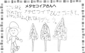 そんなメタセコイアさんにお別れのメッセージを書きたい人を募ったら、たくさん書いてくれました。代表的なメッセージをお昼の放送で紹介しましたが、ここには絵のついたメッセージを中心に紹介します。
