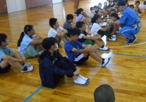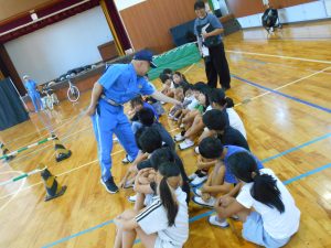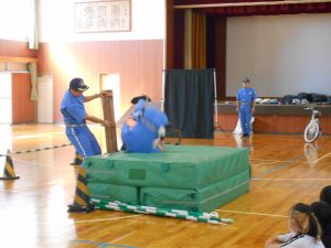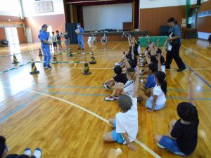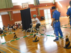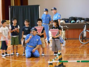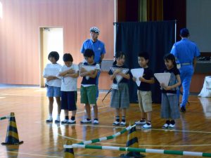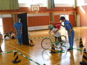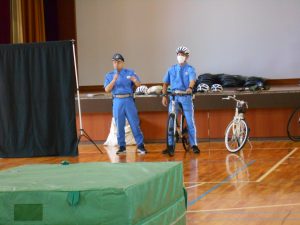 5つの左(左側から乗る・左側を走行する・左ブレーキをかける・・・)や停止線での止まり方、クイズ「正しい『止まれ』マークはどれしょう?」など、警察署の方から安全な自転車の乗り方を教えていただきました。自転車に乗るときには、ヘルメットをしっかりとかぶり、交通ルール守って安全に走行しましょう。