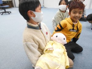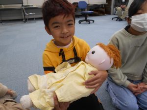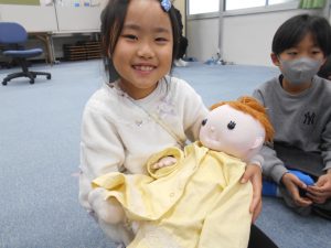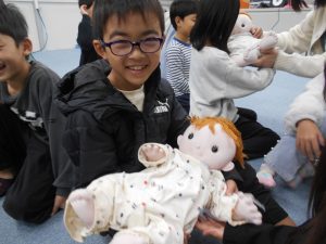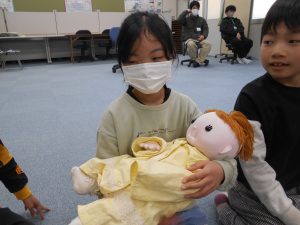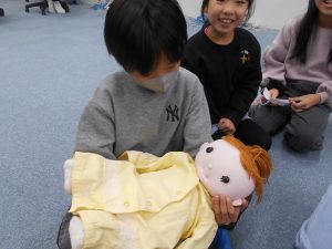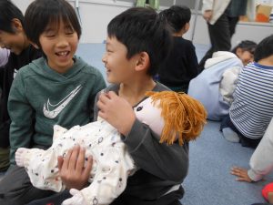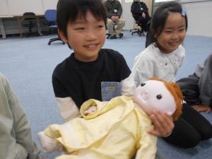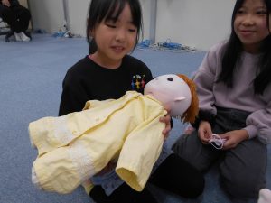 ぎこちなく人形の赤ちゃんを抱っこする2年生の子どもたち。助産師さんをお招きして「命の授業」を行いました。赤ちゃんの誕生だけではなく、赤ちゃんがどのようにして胎内で生活しているのかを知り、生まれてきた赤ちゃんはどの子もかけがえのない存在であることを学びました。とくに、赤ちゃんがどこから来るのかについての話は、黒い紙にピンホールを空けたものを電気にかざして、卵子の大きさを実感させる体験が子どもたちにとっては衝撃だったようです。