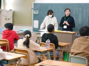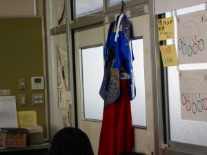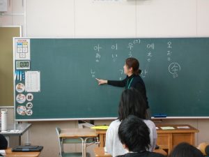 「 5月15日は何の日でしょう?4つの選択肢から選んでください。」「これは、なんと読むでしょう?」講師の方から問われると、一生懸命に考えて答える6年生。6年生の児童が、国際交流の一環として、韓国の生活や文化や習慣、韓国語などについて学びました。他国の風習や言語などについて理解を深める機会となりました。