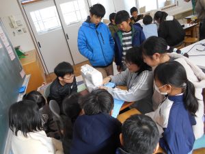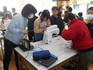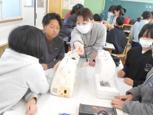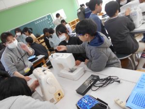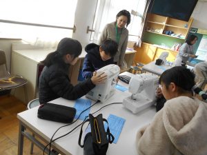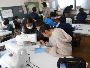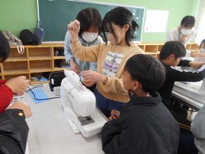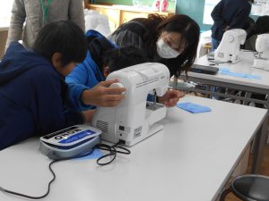 「ミシンにトライ!手作りで楽しい生活」5年生が家庭科の授業で、安全なミシンの使い方を身につけています。カバーを外す、電源スイッチが切れているかを確認する、針を付ける、コンセントにプラグを差し込むなど、細心の点まで確認をする児童。準備ができたら、次に下糸を巻く練習。不慣れだったミシン操作も、学校サポーターの方の支援のおかげもあって、コツをつかみ、操作に慣れてきました。
